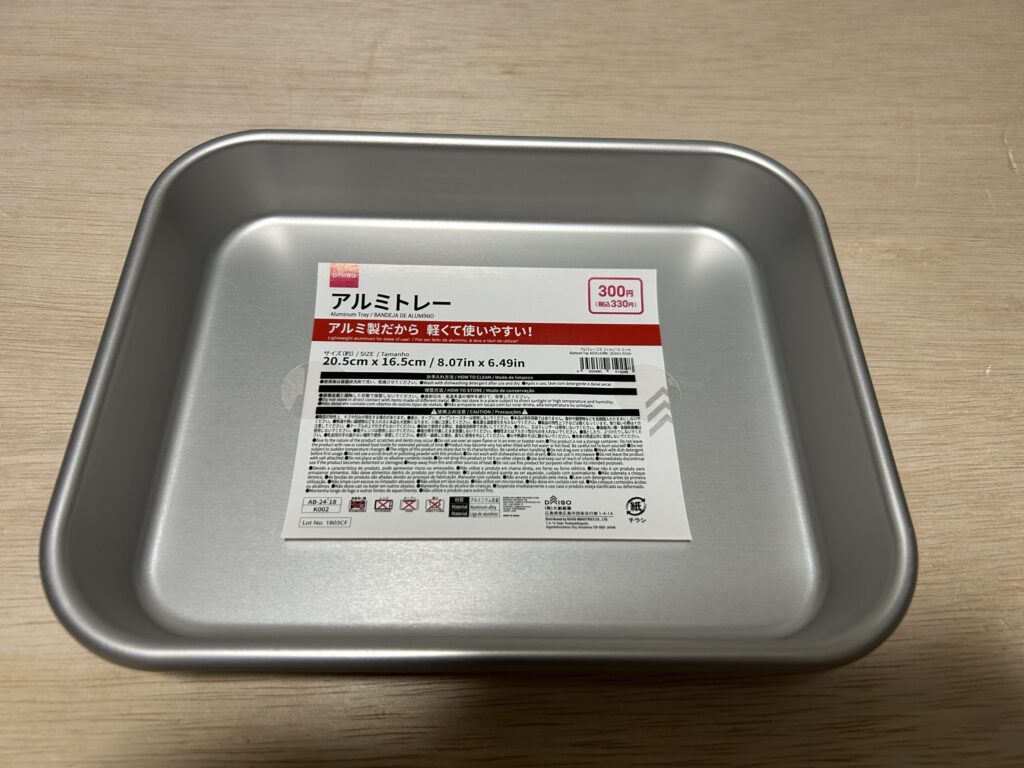「ダイソーのアルミトレー。放熱と設置安定に貢献。」
