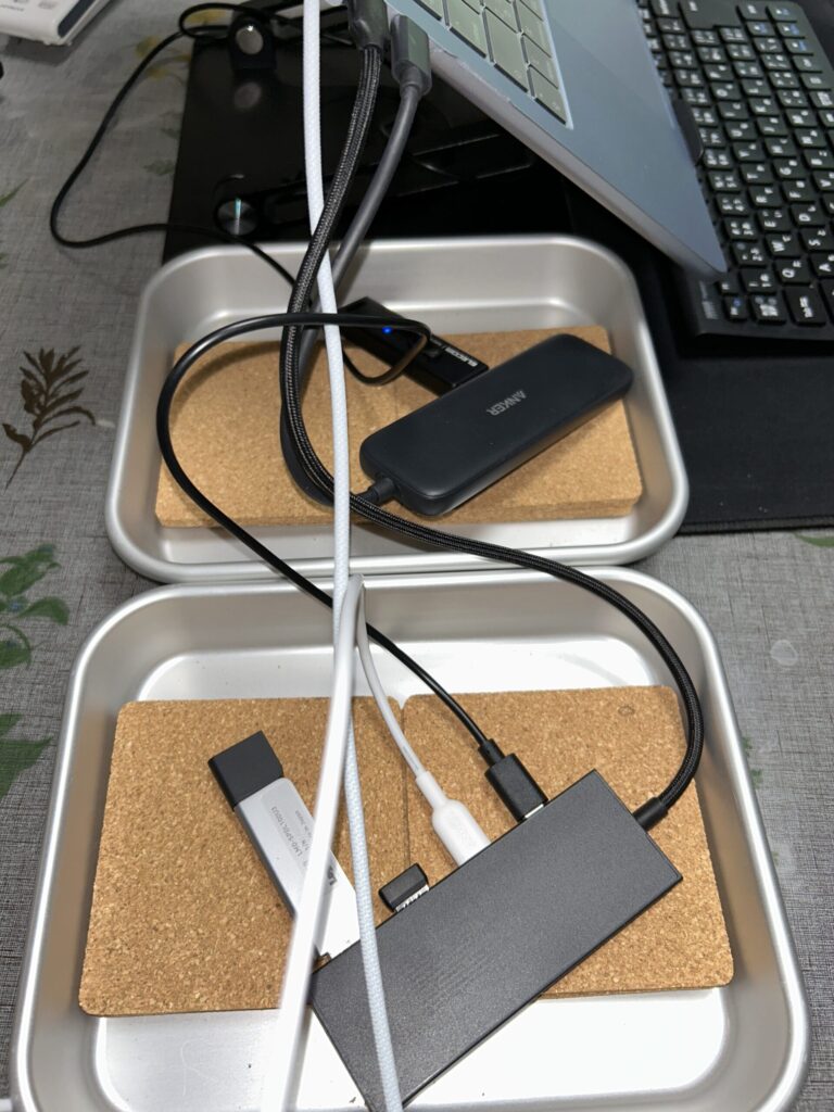 アルミトレーの上に敷いて、そこへSSDやUSBハブを置いています。